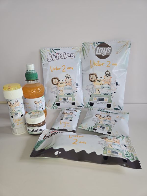 Pack de 7 produits (fruit shoot teisseire, chips, sachet haribo, kinder bueno, kinder country, nutella, tube bulles... un sachet de skittles offert pour 5 packs achetés un produit ne vous convient pas, vous pouvez le switcher avec : kinder maxi, barre lion, barre snickers, pot mini nutella, m&m's, bouteille eau 50ml tous le thèmes sont possibles, alors choisissez celui qui vous fait plaisir
