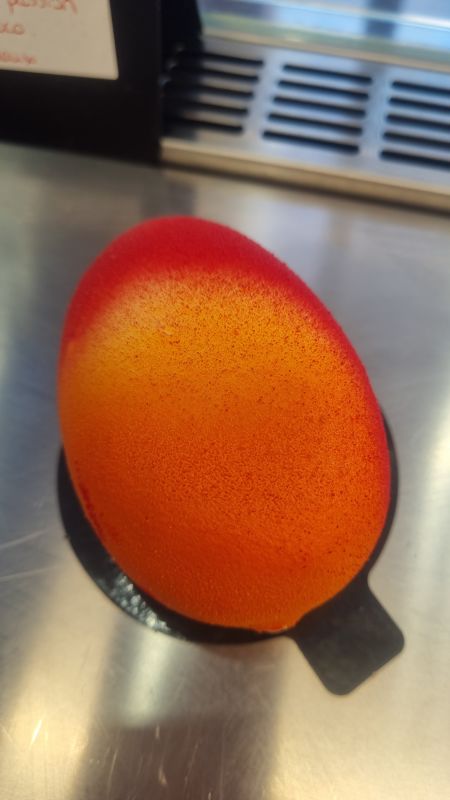 Biscuit génoise, bavaroise mangue,garni d'un insert de fruit frais; mangue coriande